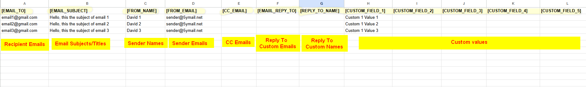Chaque ligne de votre fichier CSV représente un email. Chaque colonne représente un champ que notre système peut utiliser lors de l’envoi du message.